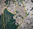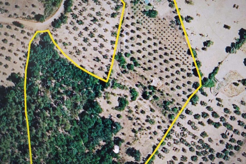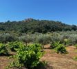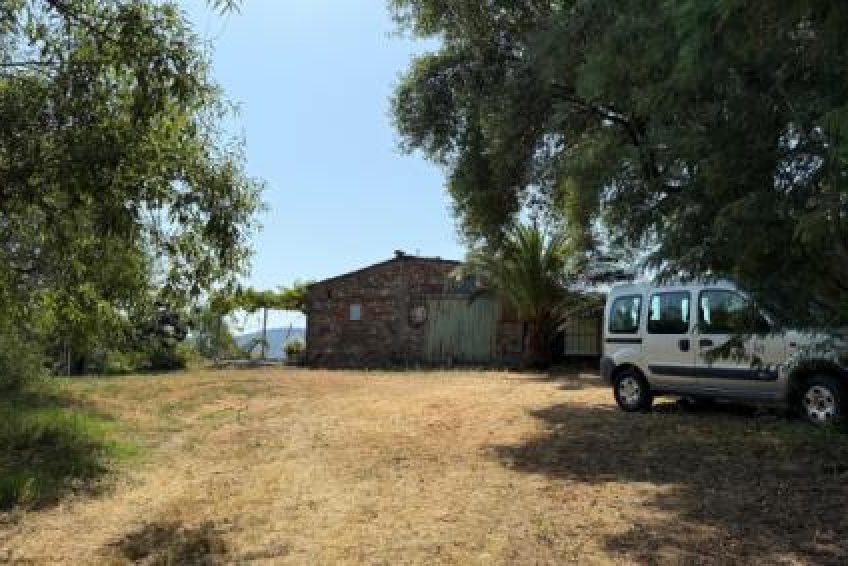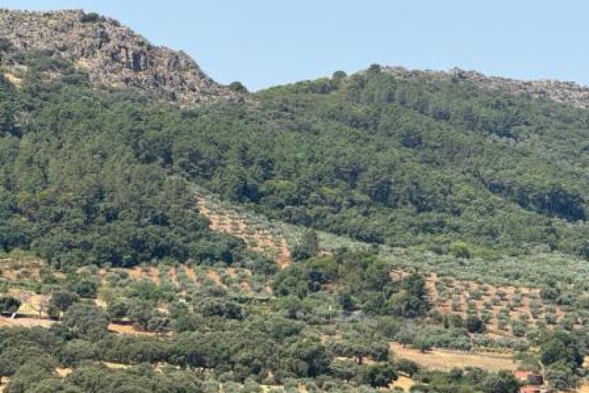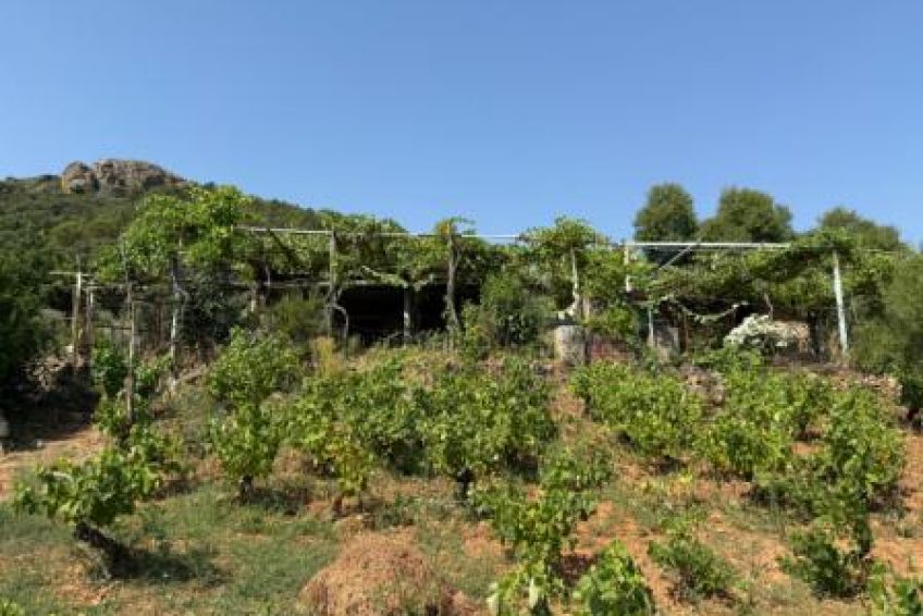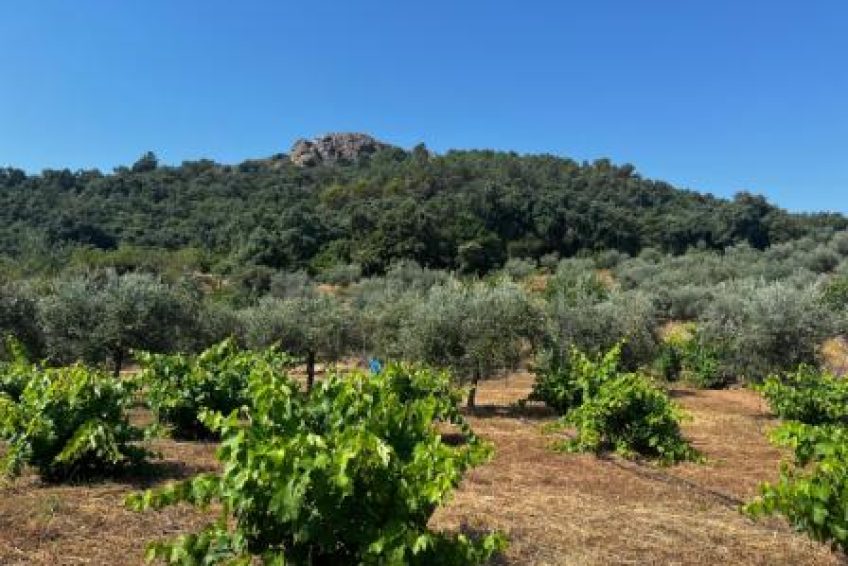 100 olivos, 200 cepas, árboles frutales, zona de monte de pinos y alcornoques.