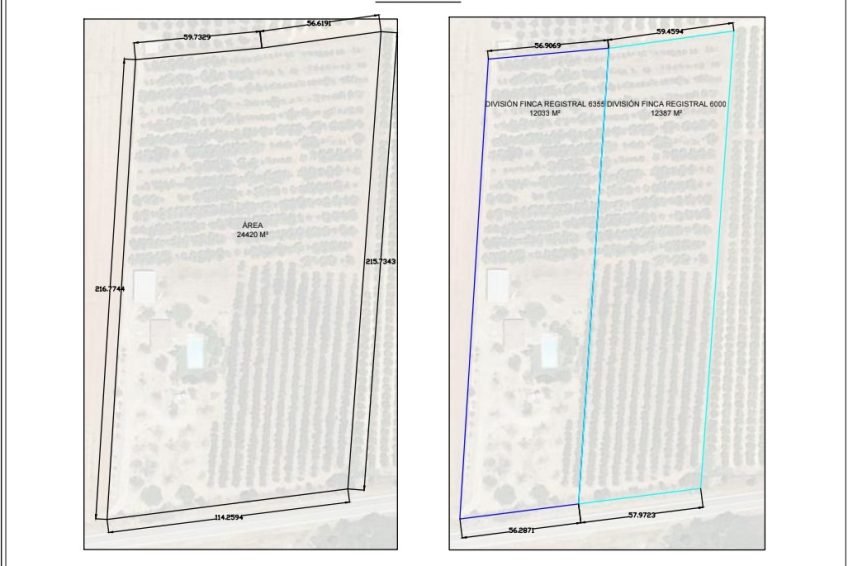 La parcela es rectangular, con 115m de fachada a la carretera, con vallado perimetral, y rodeada de explotaciones de naranjos y olivos.