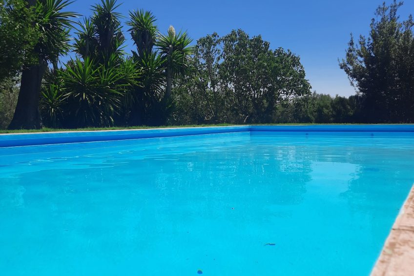 La piscina mide 12,50 m de largo, 5,50 m de ancho y 2,20 m por la parte más profunda. Está rodeada de césped, con seto de romero, yucas, adelfas y árboles frutales (naranjos, granado, laurel y peral).