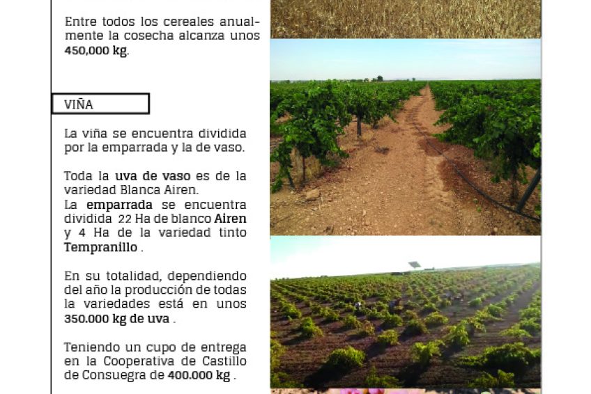 Viña, La viña se encuentra dividida por la emparrada y la de vaso . Toda la uva de vaso es de la variedad Blanca Airen, por otra parte la emparrada se encuentra dividida 22 Ha de Blanco Airen y 4Ha de la variedad Tinto Tempranillo .
