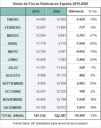 El Instituto Nacional de Estadística ha publicado en su página web Estadísticas de Transmisión de Derechos de Propiedad los datos referentes a la venta de fincas rústicas en España durante el año 2020.