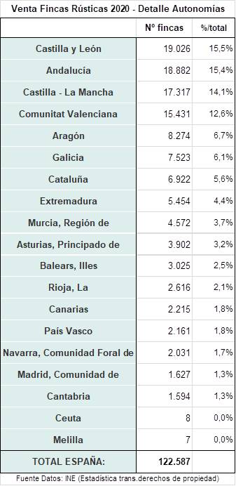La comunidad más activa sigue siendo Castilla y León, sin que haya habido ninguna variación en la posición de las distintas Comunidades Autónomas. No obstante,  destacar especialmente que durante este año tan complicado en la Comunidad Valenciana se han vendido más fincas rústicas que en el año 2019 (5% de incremento respecto a las 14.601 fincas transmitidas en el año anterior).